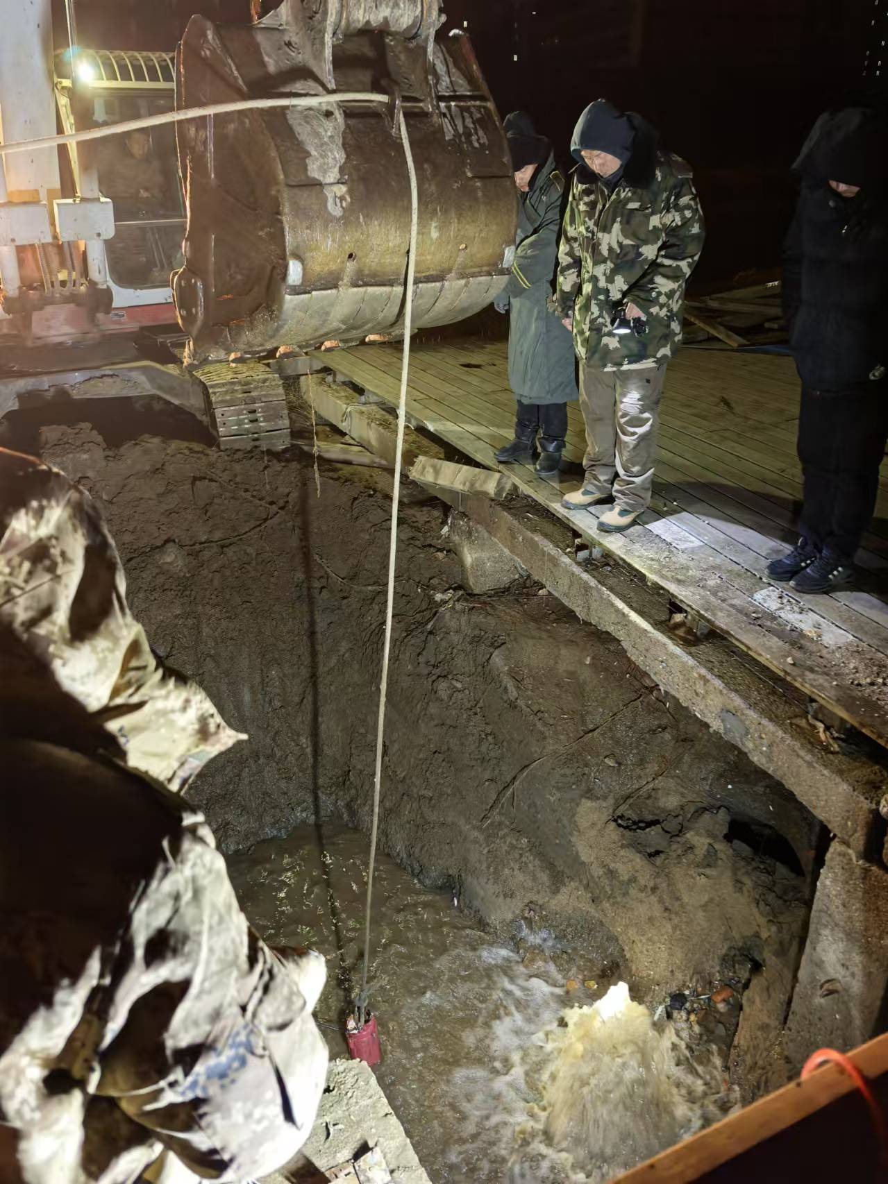搶修人員進入施工現場后,通過仔細勘察確定維修方案,隨即展開接電、排水、挖掘土方等維修工作。由于主管線位于地下5米多深的砂石土質,挖掘時又多次出現塌方,施工一度受挫。為縮短搶修時間,盡快恢復供水,我處先后將4個維修隊調入施工現場,輪番上陣。搶修人員在深夜靠著應急燈照亮,冒著零下四五度的低溫,在冰冷的泥漿中爭分奪秒、連續奮戰,經過15個小時的奮力搶修于次日早上7點30分恢復供水。
